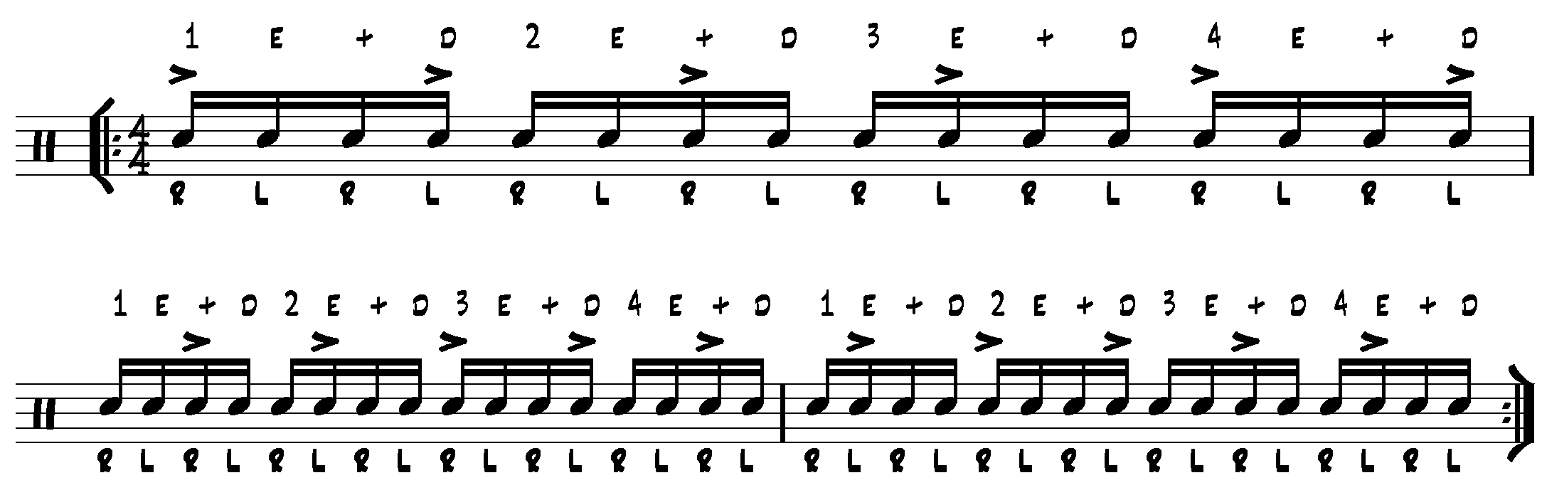 Der erste Akzent liegt natürlich auf der „1“ im ersten Takt. Der zweite Akzent folgt dann auf „1d“. Und der dritte Akzent folgt auf „2+“. Danach folgen noch Akzente auch „3e“, „4“ und „4d“ im ersten Takt. Im zweiten Takt werden die Zählzeiten „1+“, „2e“, „3“, „3d“ und „3+“. Die Akzente im dritten Takt liegen auf den Zählzeiten „1e“, „2“, „2d“, „3+“ und „4e“. Wie übt man nun so etwas?