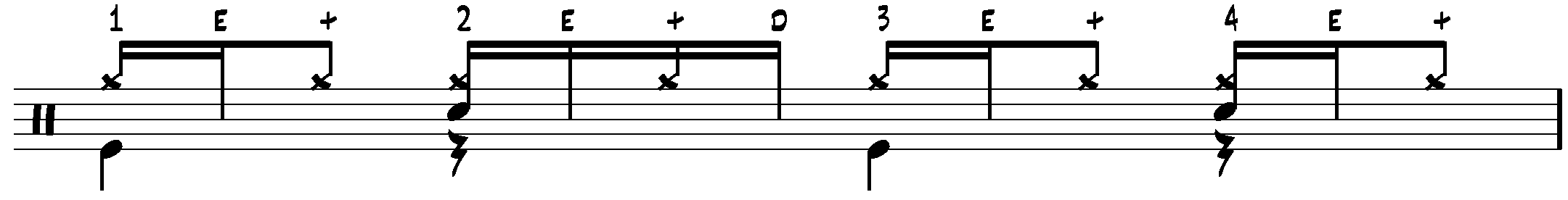 Hier haben wir wieder die Bassdrum auf „1“ und „3“. Die Ghost Notes werden auf „1e“ und „2e“ gespielt. Das geht auch durchgehend.